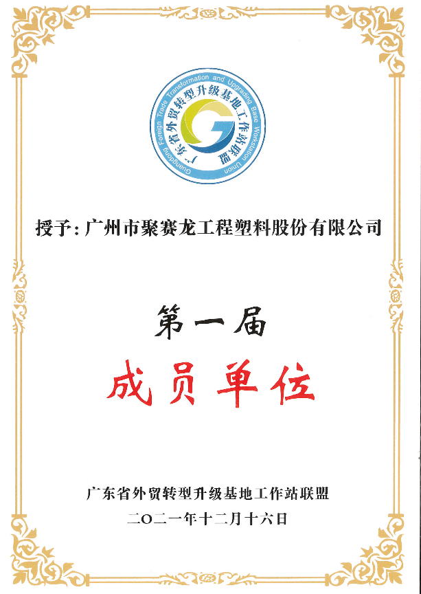 廣州市聚賽龍工程塑料股份有限公司作為廣東省廣州市從化區國家外貿轉型升級基地(新材料)工作站承辦單位,當選為第一屆廣東外貿轉型升級基地工作站聯盟成員單位。